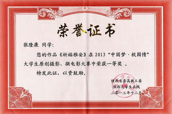 2013“中國夢?校園情”大學生原創(chuàng)攝影、微電影大賽由陜西省委高教工委和陜西大學生在線主辦,西北政法大學承辦,西安交通大學、西北農(nóng)林科技大學、西北工業(yè)大學、長安大學、西北大學、西安工程大學、西安文理學院、西安體育學院、西安翻譯學院協(xié)辦。大賽旨在深入貫徹落實十八大精神,推動校園網(wǎng)絡文化建設(shè),提升陜西大學生的文化品位,豐富大學生的校園生活,宣傳和展示高校人文文化氛圍。大賽累計收到全省27所高校師生網(wǎng)上投稿作品3252幅,最終評選出攝影作品一等獎5名,二等獎10名,三等獎13名,優(yōu)秀獎14名;微電影作品一等獎1名,二等獎2名,三等獎3名,優(yōu)秀獎15名。