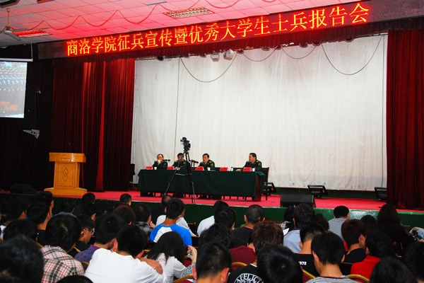 青春獻(xiàn)國(guó)防,建功在軍營(yíng)。為促進(jìn)我校學(xué)生對(duì)大學(xué)生參軍入伍相關(guān)政策和知識(shí)的了解,鼓勵(lì)青年大學(xué)生投身國(guó)防建設(shè),5月7日,我校召開2014年征集大學(xué)生士兵政策宣講暨優(yōu)秀大學(xué)生軍人事跡報(bào)告會(huì)。校黨委副書記左曉民、商洛軍分區(qū)政委張永忠、商州區(qū)武裝部政委張翔、副部長(zhǎng)劉永凱、商洛軍分區(qū)征兵辦公室科長(zhǎng)沈禮軍出席會(huì)議,全體輔導(dǎo)員及學(xué)生代表400余人參加了會(huì)議。會(huì)議由商州區(qū)武裝部政委張翔主持。