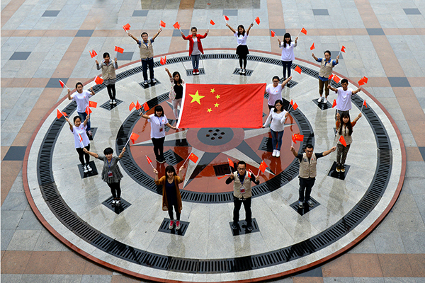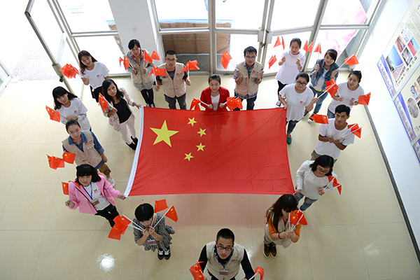 在中華人民共和國(guó)65周年華誕到來(lái)之際,有網(wǎng)友發(fā)起“我和國(guó)旗合個(gè)影,我為中國(guó)點(diǎn)個(gè)贊”活動(dòng),迅速燃起了網(wǎng)友們的愛國(guó)熱情,短短幾天內(nèi),該話題在微博上的閱讀量就超過(guò)6000萬(wàn)。該活動(dòng)在我校也受到熱捧。近日,我校大學(xué)生通訊社的同學(xué)們自發(fā)開展了“我與國(guó)旗合個(gè)影 我向祖國(guó)獻(xiàn)祝福”活動(dòng),拍攝并在微博上展示自己與國(guó)旗的合影,撰寫或轉(zhuǎn)發(fā)祝福祖國(guó)的話語(yǔ),用鮮艷的五星紅旗、最美的笑臉、最真的祝福為祖國(guó)65周年生日華誕獻(xiàn)禮。