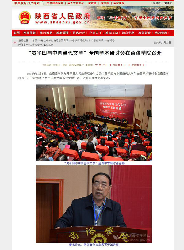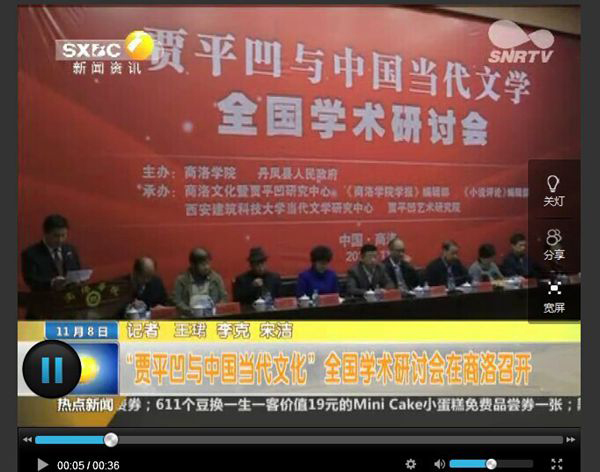 陜西廣播電視臺:11月8日陜西一套《第一新聞(午間播報(bào))》欄目http://www.snrtv.com/content/2014-11/08/content_11808462.htm#(點(diǎn)擊該網(wǎng)絡(luò)鏈接,查找該頁面下方第13個(gè)新聞視頻《“賈平凹與中國當(dāng)代文化”全國學(xué)術(shù)研討會在商洛召開》)