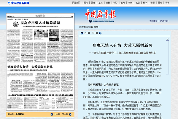 3月30日,《中國教育報(bào)》第8版以《病魔無情人有情 大愛無疆樹新風(fēng)》為題,對我校踐行社會主義核心價(jià)值觀救助患白血病教師王珍琪系列活動(dòng)進(jìn)行了報(bào)道。該文一經(jīng)刊發(fā),新華網(wǎng)、中國網(wǎng)等全國各大媒體紛紛轉(zhuǎn)載,在社會上引起了強(qiáng)烈反響。