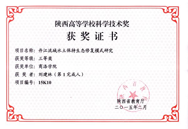 根據(jù)陜西省教育廳《關(guān)于公布2015年度陜西高等學(xué)??茖W(xué)技術(shù)獎(jiǎng)的通知》(陜教技〔2015〕3號(hào)),由我校劉建林教授主持申報(bào)的《丹江流域水土保持生態(tài)修復(fù)模式研究》,榮獲2015年度陜西高等學(xué)??茖W(xué)技術(shù)獎(jiǎng)三等獎(jiǎng)。