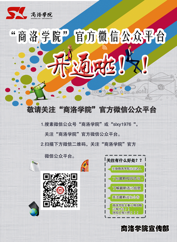 為適應(yīng)新媒體時(shí)代的形勢(shì)發(fā)展需要,拓展我校宣傳工作,更好地服務(wù)師生、宣傳校園文化,近日,我校正式開通了官方微信公眾平臺(tái)“商洛學(xué)院”,微信號(hào)為slxy1976。