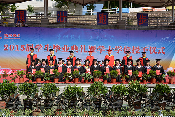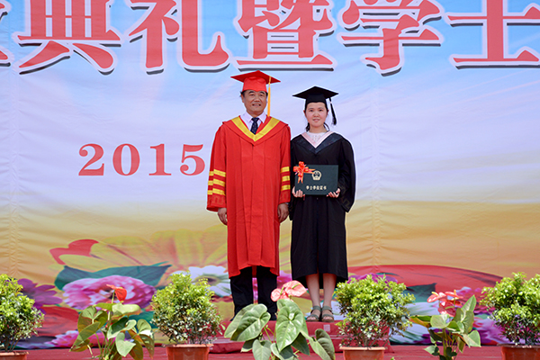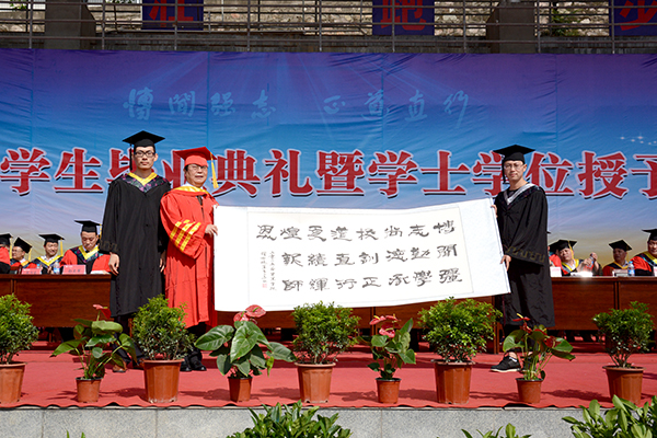 畢業(yè)典禮暨學(xué)士學(xué)位授予儀式在莊嚴(yán)的國歌聲中開始。為了感謝母校的培育之恩,全體2015屆畢業(yè)生向母校贈(zèng)送書法作品“博聞強(qiáng)志勤學(xué)尚德承校訓(xùn) 正道直行更續(xù)輝煌報(bào)師恩”,作為永久的紀(jì)念,張景書代表學(xué)校接受了禮物。