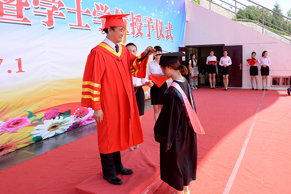 在學(xué)士學(xué)位授予儀式上,畢業(yè)生們依次走上主席臺(tái),校長劉建林為獲得學(xué)士學(xué)位的畢業(yè)生正冠撥蘇、頒發(fā)學(xué)位證書,并同他們一一合影留念。