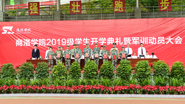 天朗氣清、秋風(fēng)送爽,巍巍學(xué)府、德渥群芳。9月5日上午,我校2019級(jí)學(xué)生開(kāi)學(xué)典禮暨軍訓(xùn)動(dòng)員大會(huì)在學(xué)校體育場(chǎng)隆重舉行。黨委書(shū)記龍治剛、校長(zhǎng)范新會(huì)、紀(jì)委書(shū)記王思懷、黨委副書(shū)記彭虎軍,副校長(zhǎng)劉寶盈、劉勇,商州區(qū)人民武裝部部長(zhǎng)曹建明上校,武警商洛支隊(duì)副參謀長(zhǎng)、軍訓(xùn)團(tuán)團(tuán)長(zhǎng)呂喆中校,2015屆校友、第44屆世界技能大賽銅獎(jiǎng)獲得者、中航工業(yè)陜西飛機(jī)制造公司職工高雨楠出席大會(huì)。各二級(jí)學(xué)院(部)黨政主要負(fù)責(zé)人、有關(guān)職能部門(mén)負(fù)責(zé)人,2019級(jí)全體新生及家長(zhǎng)代表參加大會(huì)。大會(huì)由彭虎軍主持。