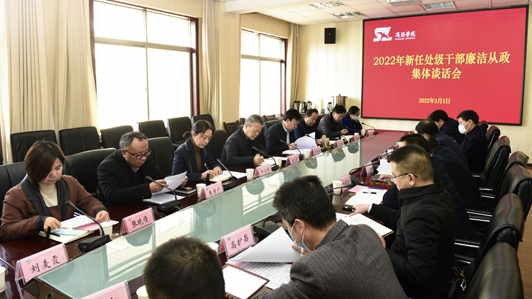 3月3日上午,我校召開2022年新任處級干部廉潔從政集體談話會。校黨委書記張志昌出席會議并講話,黨委副書記彭虎軍主持會議。紀(jì)委、組織部負(fù)責(zé)人及21名新任處級干部參加會議。