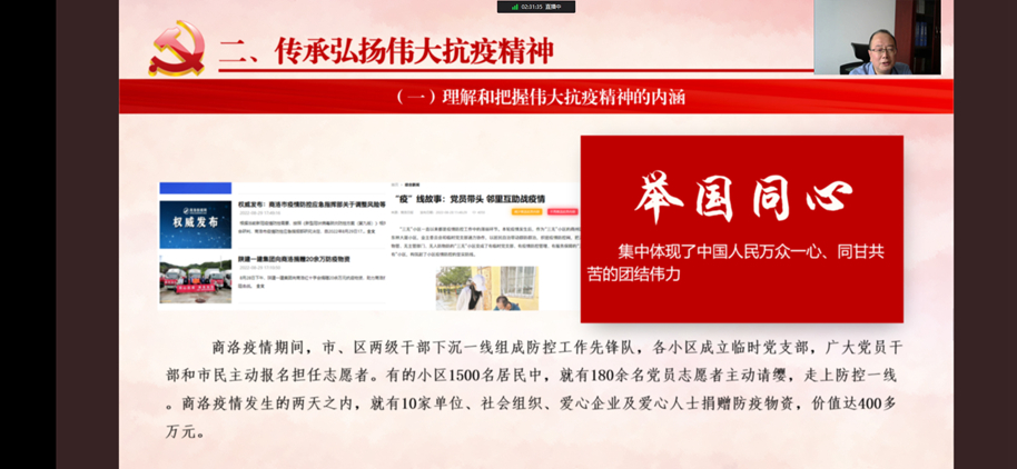 校長范新會在講授中引用多個鮮活事例,生動形象地闡述了生命至上、舉國同心、舍生忘死、尊重科學、命運與共的偉大抗疫精神內涵,系統(tǒng)性總結了中國戰(zhàn)“疫”取得的偉大成就。結合近期國內、我省和商州區(qū)等疫情防控形勢,范新會強調,青年學生要深刻理解和傳承弘揚偉大抗疫精神,把握偉大抗疫精神的內涵。一是要肩負使命擔當,與祖國和人民同呼吸共命運。青年學生要把學問做在祖國大地上,做接地氣的真學問,要到祖國和人民最需要的地方去摸爬滾打,在疫情防控、科技創(chuàng)新、鄉(xiāng)村振興中發(fā)光發(fā)熱,從中找到人生真諦、生命價值和事業(yè)方向。二是要厚植愛國情懷,做積極戰(zhàn)“疫”的先行者。青年學生要帶頭遵守疫情防控各項要求,主動傳播疫情防控權威信息,分享正能量抗疫故事,解讀疫情防控方針政策。要敢于挺身而出,發(fā)揮所長、盡己所能為防控工作助力。要服從組織安排,落實安全防護,規(guī)范有序參與疫情防控志愿服務,在筑牢校園、社區(qū)防疫屏障中,展現(xiàn)商洛學院人應有的昂揚斗志和青春力量。