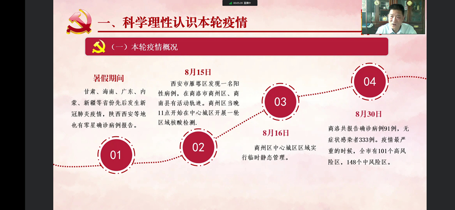 為深化大學生思想政治教育,強化師生疫情防控意識,引導廣大青年學生嚴格落實疫情防控各項工作要求,弘揚偉大抗疫精神,以實際行動迎接黨的二十大勝利召開,8月31日下午,校領導張志昌、范新會、彭虎軍、劉勇、劉寶盈、王新軍、郭瑾以“云端授課”的形式,為全體學生講授“開學第一課”。