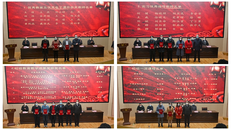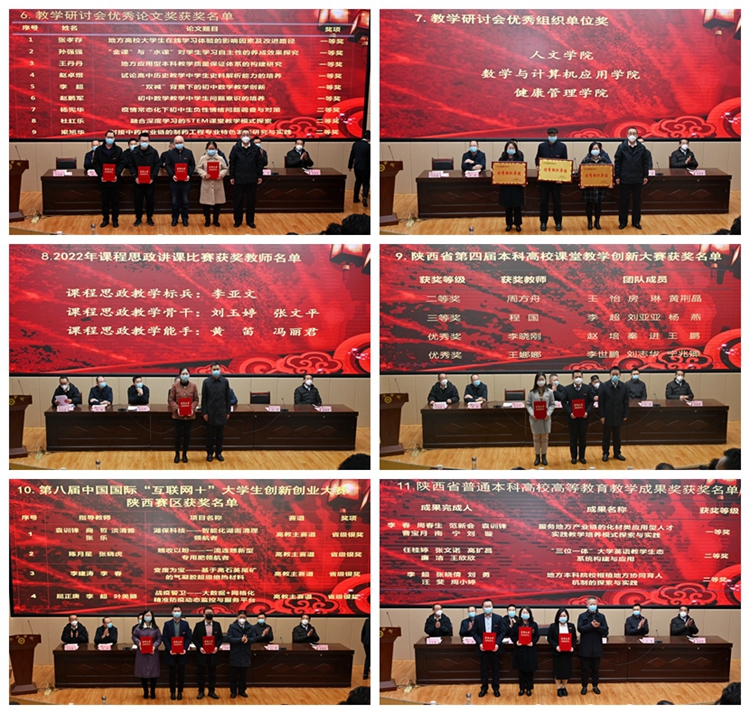 大會(huì)對我校2022年度優(yōu)秀教案、優(yōu)秀電子課件獲獎(jiǎng)教師,優(yōu)秀實(shí)習(xí)指導(dǎo)教師、優(yōu)秀畢業(yè)論文指導(dǎo)教師,校級教育教學(xué)成果獎(jiǎng)、校級一流課程、教育教學(xué)研討會(huì)優(yōu)秀論文、優(yōu)秀組織單位、校級課程思政講課比賽獲獎(jiǎng)教師、陜西省第四屆本科高校課堂教學(xué)創(chuàng)新大賽獲獎(jiǎng)教師、第八屆中國國際“互聯(lián)網(wǎng)+”大學(xué)生創(chuàng)新創(chuàng)業(yè)大賽指導(dǎo)教師、陜西省普通本科高校高等教育教學(xué)成果獎(jiǎng)獲獎(jiǎng)教師進(jìn)行了表彰。出席大會(huì)的校領(lǐng)導(dǎo)為受表彰的集體和個(gè)人頒發(fā)了證書。