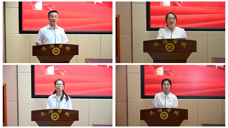 優(yōu)秀基層黨組織代表、經(jīng)管學(xué)院黨委書記高擴(kuò)昌,優(yōu)秀黨務(wù)工作者代表、電信學(xué)院學(xué)工辦主任陳倩,優(yōu)秀教工黨員代表、建工學(xué)院教師曹琛,優(yōu)秀學(xué)生黨員代表、健康管理學(xué)院護(hù)理2221班學(xué)生申愛霞分別作了交流發(fā)言。