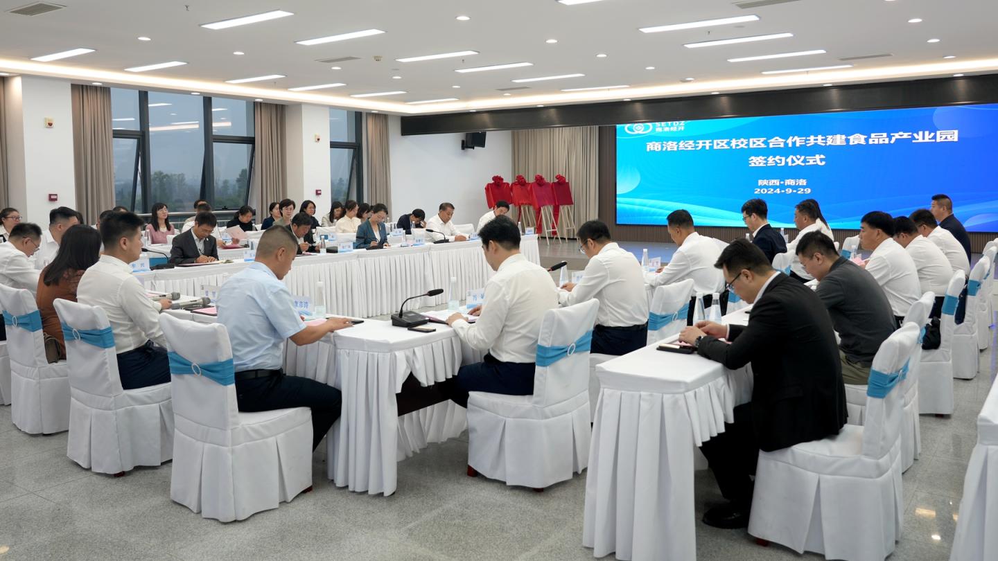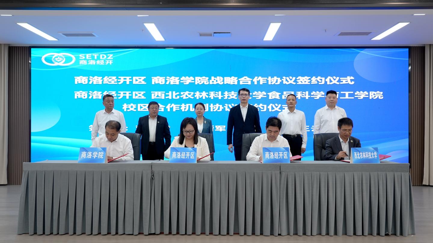 為推動(dòng)校區(qū)合作和產(chǎn)學(xué)研深度融合,提升商洛經(jīng)濟(jì)技術(shù)開發(fā)區(qū)科技創(chuàng)新與經(jīng)濟(jì)發(fā)展效能,9月29日,商洛經(jīng)開區(qū)校區(qū)合作共建食品產(chǎn)業(yè)園簽字儀式在商洛市舉行。商洛市委副書記、商洛經(jīng)開區(qū)黨工委書記趙孝,洛南縣委書記楊長(zhǎng)江,校長(zhǎng)權(quán)雅寧、副校長(zhǎng)王新軍出席簽約儀式。趙孝、權(quán)雅寧共同為“商洛學(xué)院陜西省大學(xué)科技園綠色食品產(chǎn)學(xué)研示范基地”和“商洛學(xué)院電商直播實(shí)踐教學(xué)基地”揭牌。王新軍代表學(xué)校和商洛經(jīng)開區(qū)黨工委副書記蔣金君簽署戰(zhàn)略合作協(xié)議。簽約儀式由商洛經(jīng)開區(qū)管委會(huì)主任彭書旺主持。