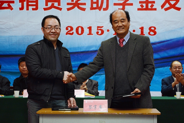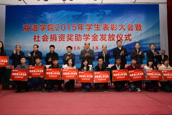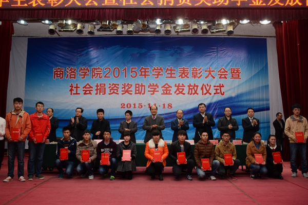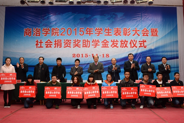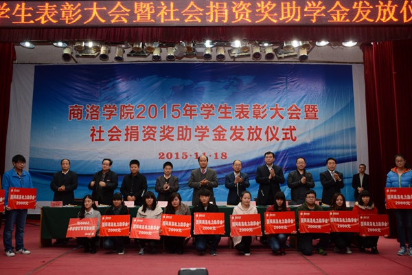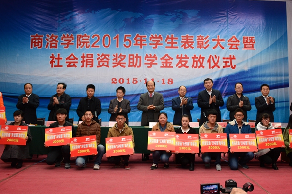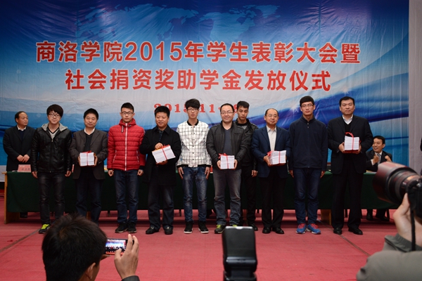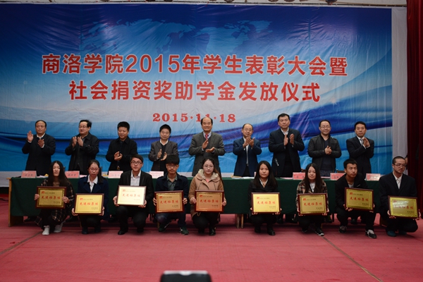 11月18日,我校舉辦2015年學(xué)生表彰大會暨社會捐資獎助學(xué)金發(fā)放儀式, 表彰2014-2015學(xué)年先進(jìn)班集體、三好學(xué)生和優(yōu)秀學(xué)生干部,舉行商洛學(xué)院與陜西森弗天然制品有限公司校企合作簽字儀式,發(fā)放“國網(wǎng)商洛電力”助學(xué)金、商洛聯(lián)通“沃校園”助學(xué)金、商洛郵政“鴻雁愛心”助學(xué)金、商洛電信“天翼”助學(xué)金、“森弗愛心”獎學(xué)金和“森弗愛心”助學(xué)金。校領(lǐng)導(dǎo)劉建林、魏書堂、彭虎軍,商洛供電局黨委書記陳飛,中國聯(lián)通商洛分公司總經(jīng)理古濤,商洛市郵政分公司副總經(jīng)理周永春,中國電信商洛分公司副總經(jīng)理江長路、陜西森弗天然制品有限公司董事長、總經(jīng)理金新康出席了大會。大會由學(xué)生處處長石啟英主持。