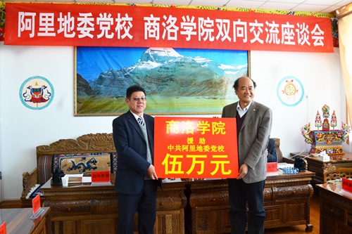 劉建林一行與中共西藏阿里地委黨校干部職工進行座談交流,并代表學校向阿里地委黨校資助5萬元,用于支持該校學科專業(yè)建設。西藏阿里地委委員、行署副專員王彪,阿里地委黨校常務副校長白瑪多吉出席座談會。座談會由阿里地委黨校副校長郭運良主持。