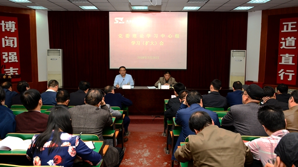 3月26日,校黨委理論學習中心組召開(擴大)會議,傳達學習貫徹2018年全國兩會精神。黨委書記龍治剛主持會議并傳達了十三屆人大一次會議精神,黨委副書記、校長范新會傳達了全國政協十三屆一次會議精神。校領導、黨委中心組成員及全校處科級干部參加會議。