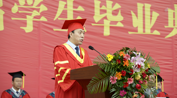 校長范新會以《不忘初心 砥礪奮進(jìn) 做新時代的奮斗者》為題發(fā)表了情真意切的講話。他深情地說,“母?!笔且粋€溫暖而幸福的字眼,是世界上最質(zhì)樸的一種情結(jié),是最為珍貴的人生記憶。過去的四年,學(xué)校事業(yè)蓬勃發(fā)展,蒸蒸日上。你們與學(xué)校共同成長、共同進(jìn)步,追求理想,砥礪前行,在這里磨礪了意志,增長了才干。你們用奮斗點(diǎn)亮了大學(xué)時光,為學(xué)校贏得了無數(shù)榮譽(yù),你們的拼搏精神和青春故事已經(jīng)深深地鐫刻在母校的記憶里!在這依依惜別的時刻,母校和老師對你們不舍再見,更為你們感到驕傲!
