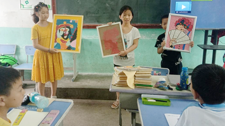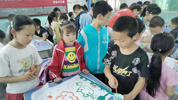 活動中,師生為該校留守兒童贈送了圖畫本、鉛筆、橡皮等繪畫用品。向小朋友們展示了校藝術學院學生制作的泥塑、石頭畫、剪紙拼畫、電腦繪畫等美術作品,拓展了小朋友們的審美視野,增強了大家的邏輯思維與形象思維能力,激發(fā)了大家熱愛美、發(fā)現(xiàn)美、追求美的熱情。師生還進行了“T恤衫彩繪”現(xiàn)場學創(chuàng)實踐,用美術實踐與T恤衫繪畫相結合的教學方式,鼓勵和引導小朋友們嘗試多樣思維和多元表現(xiàn),進一步增強了大家的實踐創(chuàng)作能力。在我校師生一對一、手把手的耐心講解與悉心指導下,每個小朋友都獨立完成了精美的美術作品。