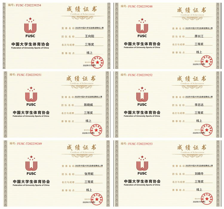近日,由中國(guó)大學(xué)生體育協(xié)會(huì)主辦,中國(guó)大學(xué)生體育協(xié)會(huì)跆拳道分會(huì)執(zhí)行,中國(guó)地質(zhì)大學(xué)(北京)承辦的2022年中國(guó)大學(xué)生跆拳道舞線上賽圓滿(mǎn)落幕。經(jīng)過(guò)與來(lái)自廈門(mén)大學(xué)、北京交通大學(xué)、中國(guó)地質(zhì)大學(xué)、西安電子科技大學(xué)、成都體育學(xué)院等全國(guó)47所高校,54支代表隊(duì)激烈比拼,我校獲三等獎(jiǎng)。