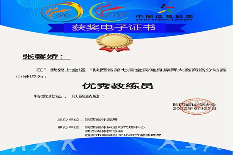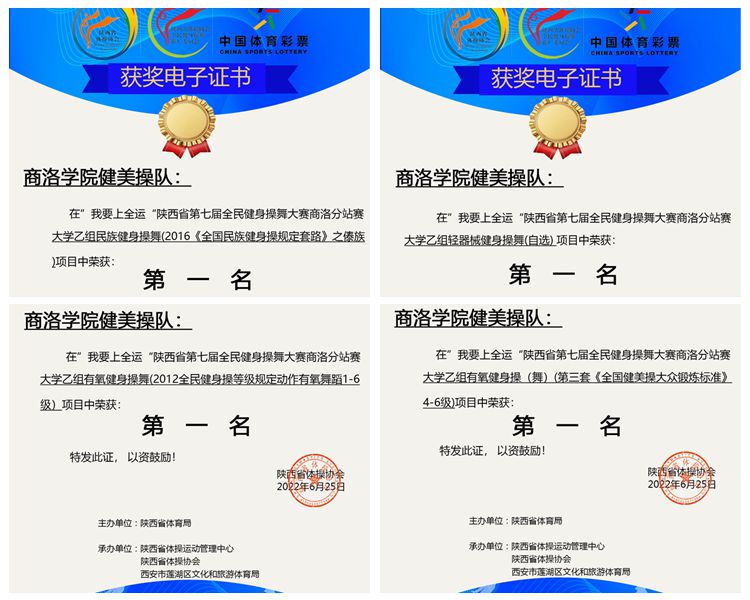 近期,陜西省第七屆全民健身操舞線上比賽圓滿落幕。我校派出由12名學(xué)生組建的健美操隊(duì)參加比賽,分別獲得大學(xué)乙組民族健身操舞(傣族舞)一等獎(jiǎng)、輕器械健身操舞(自選)一等獎(jiǎng)、有氧舞蹈一等獎(jiǎng)及全國(guó)健美操大眾鍛煉標(biāo)準(zhǔn)(4-6級(jí))一等獎(jiǎng)的優(yōu)異成績(jī),體育教學(xué)研究部教師張馨嬌被評(píng)為“優(yōu)秀教練員”。