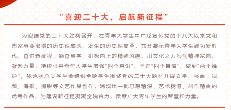 城鄉(xiāng)規(guī)劃與建筑工程學(xué)院舉辦了“喜迎黨的二十大,啟航新征程”活動,通過展現(xiàn)學(xué)生自行創(chuàng)作的黨的二十大題材文學(xué)、書畫、視頻、海報(bào)、攝影等文藝作品,充分展示了青年大學(xué)生奮進(jìn)新征程、建功新時(shí)代,勤奮篤學(xué)、積極向上的精神風(fēng)貌。