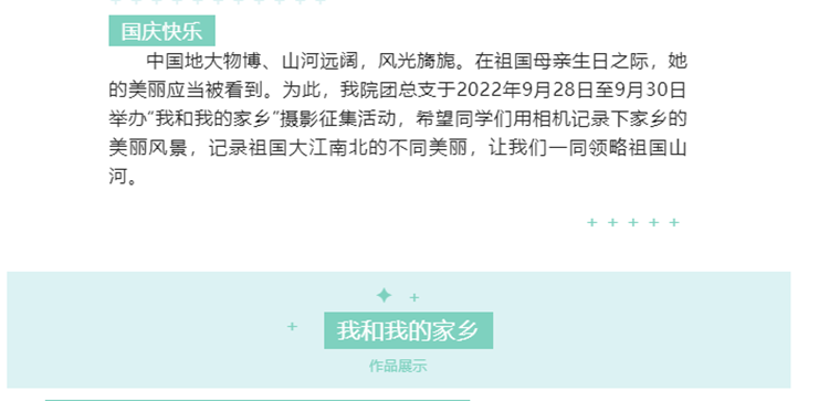 經(jīng)濟(jì)管理學(xué)院舉辦了“我和我的家鄉(xiāng)”作品展,通過同學(xué)們記錄的家鄉(xiāng)美麗風(fēng)景,展現(xiàn)祖國的大好河山,激發(fā)學(xué)生愛國之情和建設(shè)家鄉(xiāng)之志。