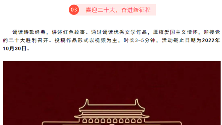 為深入開展“青春獻(xiàn)禮黨的二十大,強(qiáng)國有我新征程”主題宣傳教育活動,熱烈慶祝中華人民共和國成立73周年,引導(dǎo)和激勵(lì)廣大師生厚植愛國主義情懷,營造網(wǎng)絡(luò)文明新風(fēng),國慶節(jié)期間,我校組織開展了豐富多彩的“喜迎黨的二十大 歡度國慶節(jié)”系列主題活動。廣大師生通過各級各類網(wǎng)絡(luò)平臺和線上活動,用自己的方式為祖國送上美好祝福,禮贊新時(shí)代奮進(jìn)征程,以良好的精神面貌和昂揚(yáng)姿態(tài)喜迎黨的二十大勝利召開。