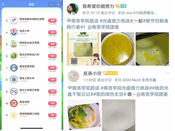 團(tuán)委宣傳部組織開展了微博曬日常綠色生活照片、光盤對(duì)比照片活動(dòng),組織學(xué)生參與了以微博話題“我的綠色生活”、“我的光盤干飯日記”為主題的高校“做節(jié)約糧食踐行者”系列活動(dòng),截至目前我?;顒?dòng)積分在全省高校排名中位居前十。