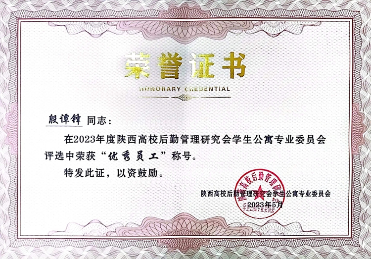 會上,陜西高校學(xué)生公寓專業(yè)委員會秘書長賈亞新宣讀了《2023年度陜西高校學(xué)生公寓先進集體、服務(wù)標(biāo)兵、優(yōu)秀員工》的表彰決定。我校后勤保障處獲得“陜西高校學(xué)生公寓先進集體”榮譽稱號,后勤保障處副處長殷譚鋒被評為陜西高校學(xué)生公寓“優(yōu)秀員工”,后勤保障處職工王鎖鋒被評為陜西高校學(xué)生公寓“服務(wù)標(biāo)兵”。后勤保障處處長李彥廣作為嘉賓之一為優(yōu)秀員工代表頒發(fā)獎狀。