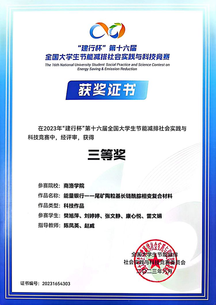 近日,由教育部高等學(xué)校能源動力類專業(yè)教學(xué)指導(dǎo)委員會指導(dǎo),全國大學(xué)生節(jié)能減排社會實(shí)踐與科技競賽委員會主辦的“建行杯”第十六屆全國大學(xué)生節(jié)能減排社會實(shí)踐與科技競賽決賽在東南大學(xué)舉行。經(jīng)過激烈角逐,化材學(xué)院劉曉芬博士指導(dǎo)完成的作品《“無塵壁壘”——自清潔尾礦基混凝土》、陳鳳英教授、趙威副教授聯(lián)合指導(dǎo)完成的作品《能量銀行——尾礦陶?;L鏈酰腙相變復(fù)合材料》從全國近7000件作品中脫穎而出,榮獲國賽三等獎。