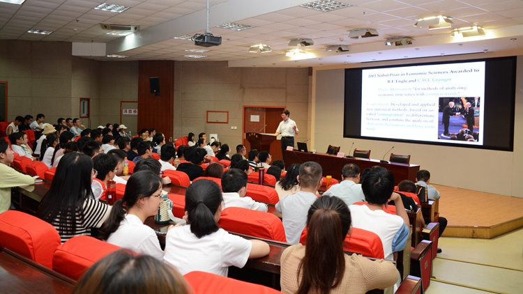 姚峰教授以《多變量時(shí)間序列因果分析的理論與應(yīng)用》為題,通過對(duì)諾貝爾經(jīng)濟(jì)學(xué)獎(jiǎng)獲得者Granger和Sims的介紹引出近年來關(guān)于時(shí)間序列因果關(guān)系方面的研究,介紹多個(gè)時(shí)間序列之間的因果關(guān)系、單方向因果測(cè)量的Wald檢驗(yàn)。報(bào)告結(jié)束后,姚峰教授就統(tǒng)計(jì)建模思想的運(yùn)用與參會(huì)師生進(jìn)行了交流與互動(dòng)。