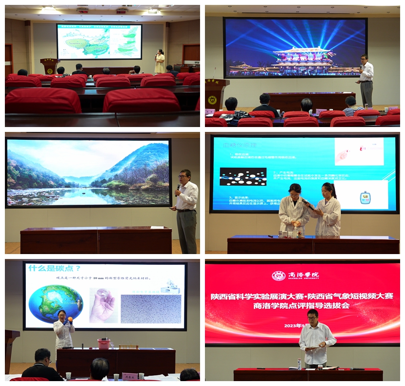 參加比賽的9組隊伍分別通過現(xiàn)場講解、視頻展示、實驗展演、情景劇場等方式展示了團(tuán)隊的科普作品。由商洛市科協(xié)科普部部長陳淑萍及我校相關(guān)專家組成的評委分別從選題方向、受眾群體、場景設(shè)計、肢體語言、實驗環(huán)節(jié)、講解技巧等方面進(jìn)行了點評與指導(dǎo)。經(jīng)過現(xiàn)場評議,推薦王毅夢、屈佳、何念竹3個團(tuán)隊參加陜西省科學(xué)實驗展演大賽;推薦房舒、張博、王緒旺3位教師參加陜西省氣象科普視頻大賽。