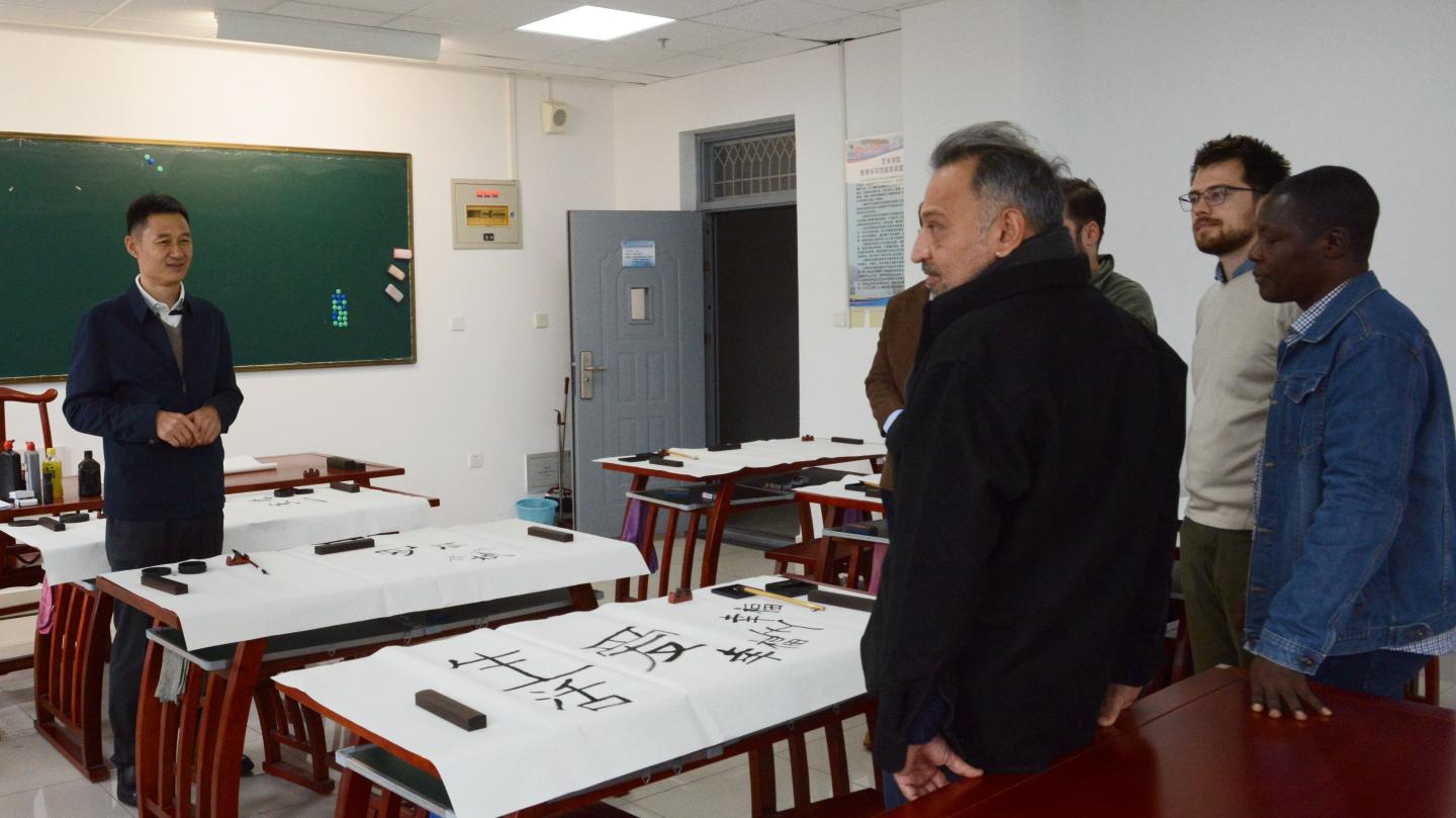 在工作人員的引導(dǎo)下,外籍教師先后參觀了經(jīng)管學(xué)院教室、綜合實(shí)驗(yàn)室、特色計(jì)算機(jī)實(shí)驗(yàn)室,電信學(xué)院實(shí)驗(yàn)室、人工智能機(jī)器人實(shí)訓(xùn)室,藝術(shù)學(xué)院智慧書法實(shí)驗(yàn)室、藝術(shù)展廳,商洛文化暨賈平凹研究中心,商洛紅色文化資料館,陜西省尾礦重點(diǎn)實(shí)驗(yàn)室,學(xué)校發(fā)展成就展廳及秦嶺植物標(biāo)本陳列室。在智慧書法教室,藝術(shù)學(xué)院教師樊洪濤為外籍教師介紹了中國(guó)書畫的傳承與發(fā)展歷史,并指導(dǎo)外籍教師進(jìn)行了書法體驗(yàn),“沉浸式”感受了中國(guó)傳統(tǒng)文化魅力。