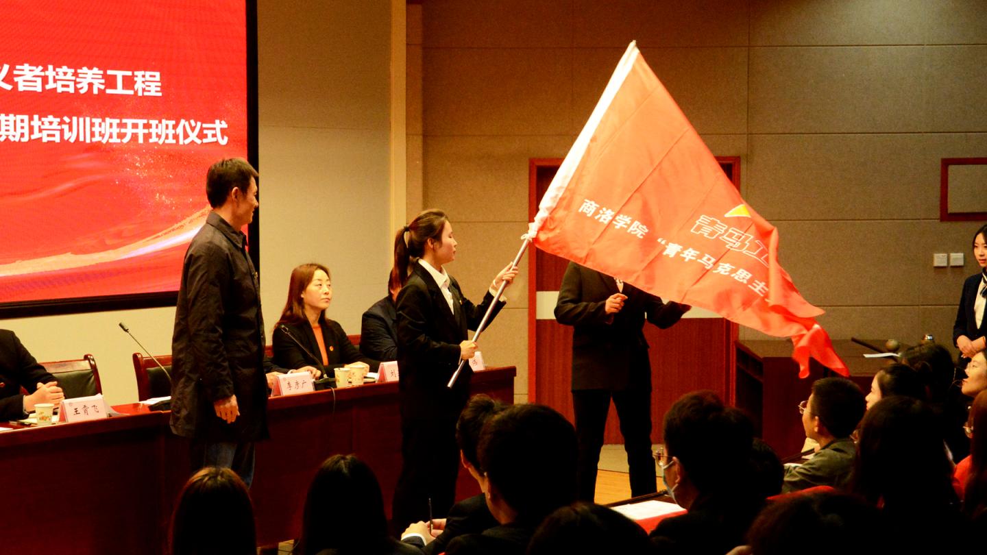 在熱烈的掌聲中,劉勇為第十二期“青馬班”授旗,并為第十二期“青馬班”指導(dǎo)教師頒發(fā)聘書。