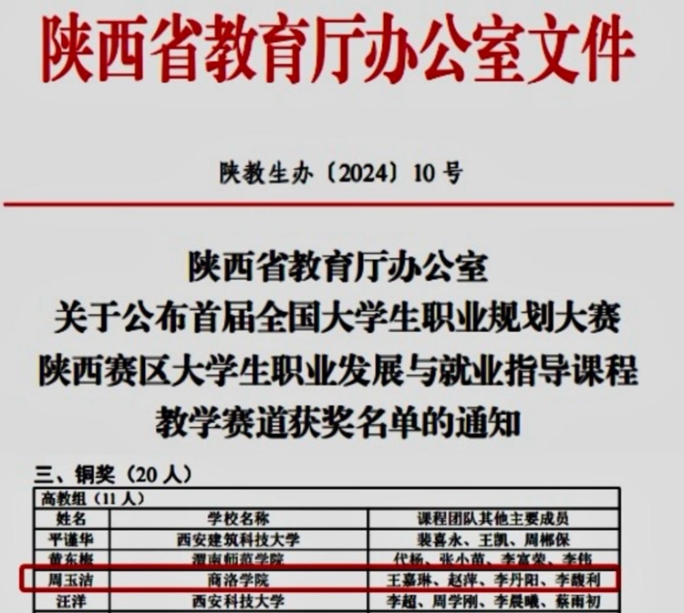 近日,陜西省教育廳公布了首屆全國(guó)大學(xué)生職業(yè)規(guī)劃大賽陜西賽區(qū)大學(xué)生職業(yè)發(fā)展與就業(yè)指導(dǎo)課程教學(xué)賽道獲獎(jiǎng)名單。我校人文學(xué)院輔導(dǎo)員周玉潔及其課程團(tuán)隊(duì)成員獲得銅獎(jiǎng)。