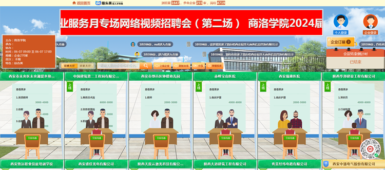 為充分落實(shí)2024屆畢業(yè)生就業(yè)“百日沖刺”行動方案,全面促進(jìn)2024屆畢業(yè)生更加充分、更高質(zhì)量就業(yè),6月7日,我校依托貓頭鷹云就業(yè)平臺舉辦2024屆畢業(yè)生春季綜合類暨民營企業(yè)服務(wù)月專場網(wǎng)絡(luò)視頻招聘會(第二場)。通過搭建“互聯(lián)網(wǎng)+視聘”線上平臺,精準(zhǔn)對接畢業(yè)生求職需求,促進(jìn)畢業(yè)生實(shí)現(xiàn)更高質(zhì)量、更加充分就業(yè)。本次招聘會由省教育廳、省就業(yè)留學(xué)中心指導(dǎo),我校和商洛市人社局主辦,我校就業(yè)中心和商洛市人才中心承辦。