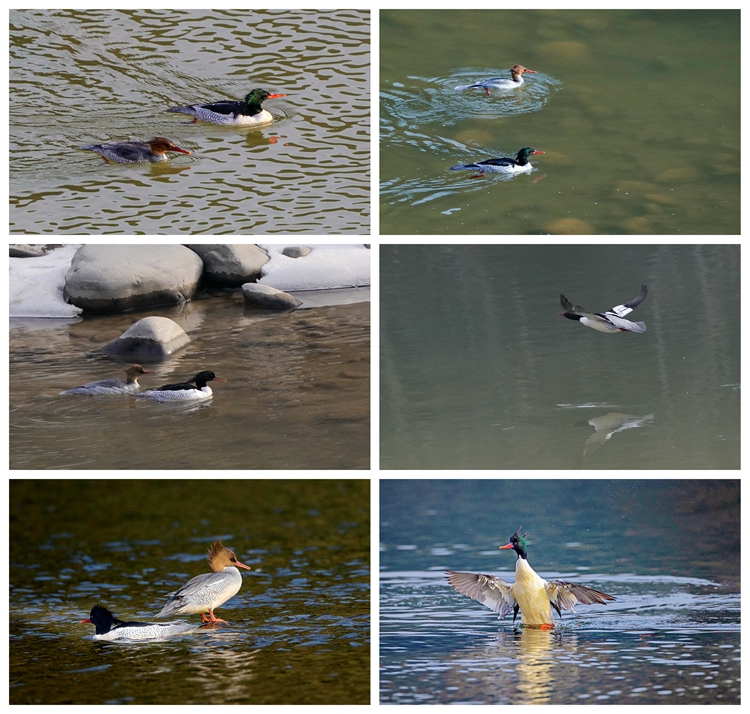 據(jù)張博介紹,12月10日,他在與山陽縣野生動(dòng)物和天然林保護(hù)管理中心(以下簡稱“天保中心”)工作人員合作開展河流、濕地動(dòng)物類群調(diào)查。在進(jìn)行調(diào)查勘察路線時(shí),發(fā)現(xiàn)2只中華秋沙鴨在水中慢游。張博立即從遠(yuǎn)處開始拍攝,隨后越過層層緩坡,走到河邊抵近觀察拍攝。順流而下的中華秋沙鴨發(fā)現(xiàn)工作人員后反轉(zhuǎn)方向逆流而上,其余5只在工作人員剛下車時(shí)受到驚嚇馬上起飛,工作人員有幸拍到了照片。
