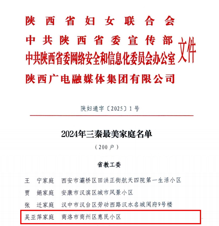 日前,陜西省婦聯(lián)揭曉了2024年“三秦最美家庭”尋找推薦結(jié)果,我校吳亞萍家庭入選上榜,獲得“2024三秦最美家庭”稱號。