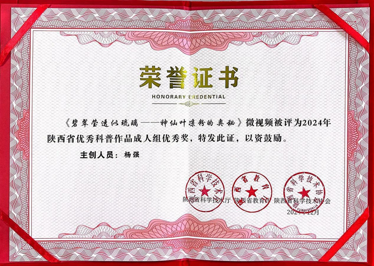 近日,陜西省科技廳、陜西省教育廳、陜西省科協(xié)聯(lián)合舉辦的2024年陜西省優(yōu)秀科普作品征集活動(dòng)公布了獲獎(jiǎng)結(jié)果,我?;膶W(xué)院教師楊強(qiáng)制作的科普作品《碧翠瑩透似琉璃——神仙葉涼粉的奧秘》榮獲陜西省優(yōu)秀科普微視頻作品成人組優(yōu)秀獎(jiǎng)。