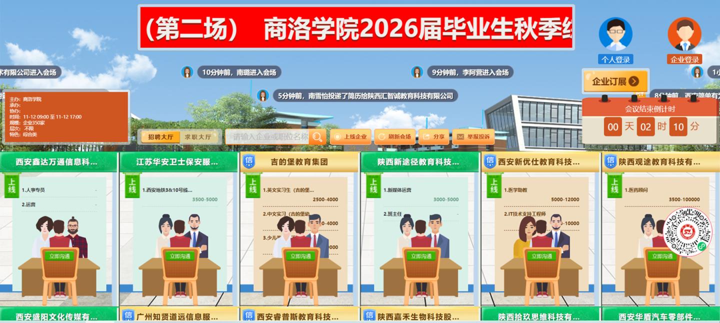 11月12日,我校舉辦2026屆畢業(yè)生秋季綜合類暨“職引未來”全國城市聯(lián)合招聘高校畢業(yè)生校園專場網(wǎng)絡視頻招聘會(第二場)。招聘會共邀請華羿微電子股份有限公司、陜西美邦藥業(yè)集團股份有限公司、西安環(huán)海機器人科技有限公司等220余家優(yōu)質(zhì)用人單位云端匯聚,為畢業(yè)生精準提供有效就業(yè)崗位4630余個。