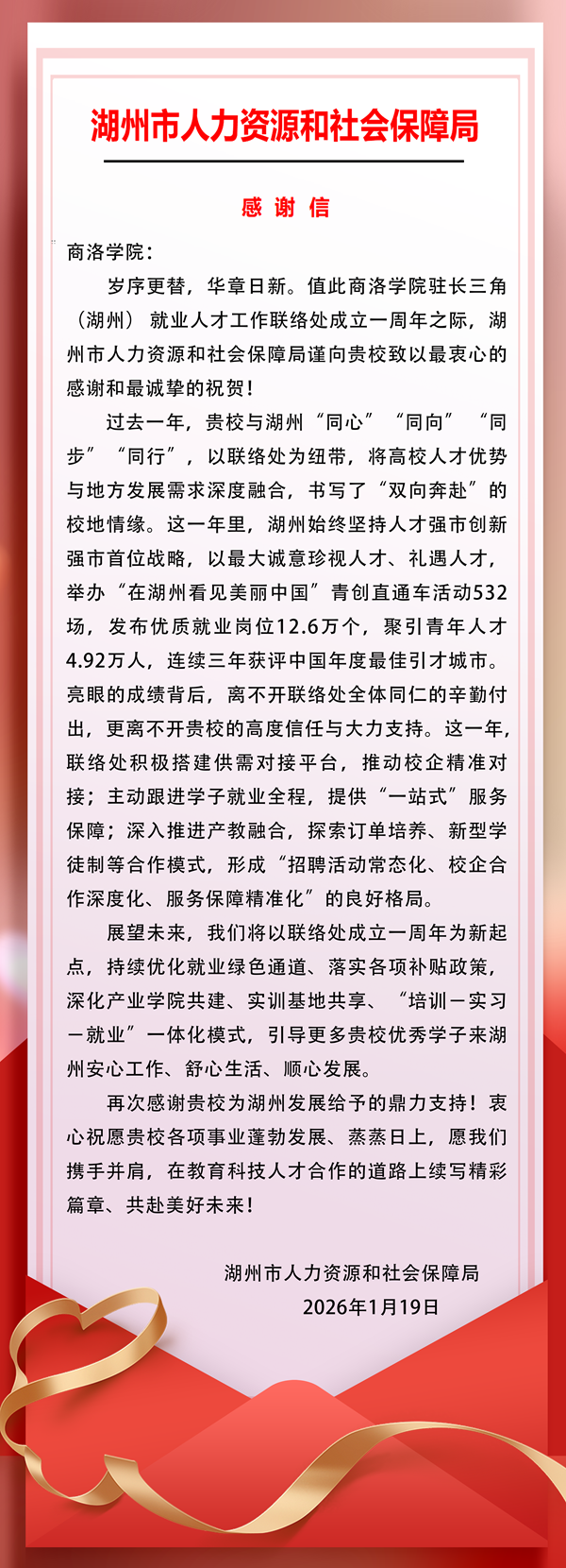 近日,湖州市人力資源和社會(huì)保障局向商洛學(xué)院發(fā)來(lái)感謝信,對(duì)學(xué)校以駐長(zhǎng)三角(湖州)就業(yè)人才工作聯(lián)絡(luò)處為紐帶,將高校人才優(yōu)勢(shì)與地方發(fā)展需求深度融合的工作實(shí)踐表示感謝,表達(dá)了與學(xué)校攜手并肩共同譜寫教育、科技、人才“三位一體”發(fā)展新篇章的良好愿景。