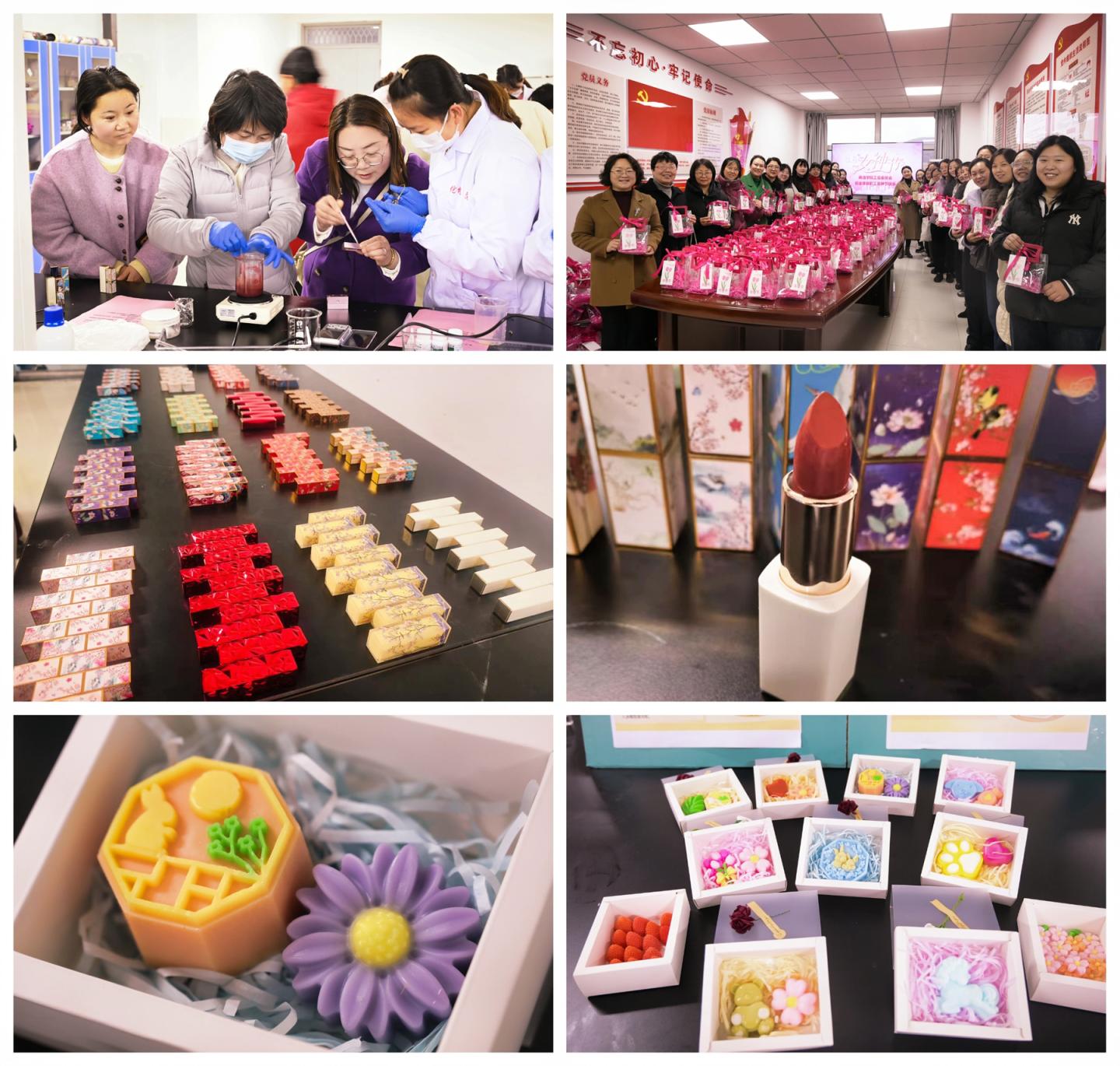 活動設置口紅唇膏與手工香皂兩大制作體驗專區(qū),配備專業(yè)指導教師進行全程講解與操作演示。參與人員按照操作指引,依次完成混合、加熱、灌裝、定型等工序,親手制作專屬節(jié)日紀念禮品。現(xiàn)場氣氛熱烈、互動踴躍,大家圍繞制作技巧與創(chuàng)意構(gòu)思深入交流,在協(xié)作共創(chuàng)中感受手工藝術(shù)的獨特魅力,歡聲笑語不斷。