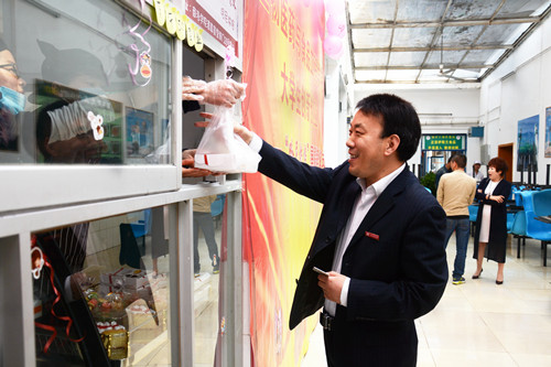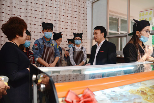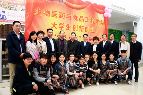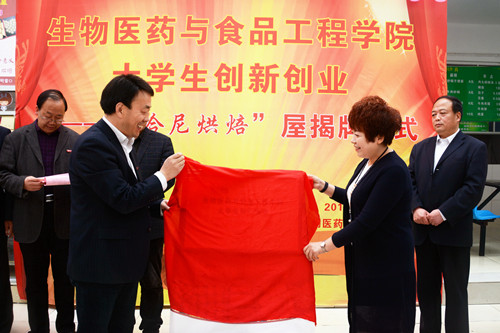 彭虎軍、金淑霞走進(jìn)“哈尼烘焙”屋與師生交流,參觀制作流程,詢(xún)問(wèn)項(xiàng)目運(yùn)營(yíng)情況,并鼓勵(lì)團(tuán)隊(duì)成員積極探索、勇于創(chuàng)新。教務(wù)處、學(xué)生處、招生就業(yè)處、校團(tuán)委、保衛(wèi)處、后勤保障處、生物醫(yī)藥與食品工程學(xué)院等單位相關(guān)負(fù)責(zé)人及“哈尼烘焙”屋創(chuàng)業(yè)團(tuán)隊(duì)成員共同見(jiàn)證“哈尼烘焙”屋揭牌。