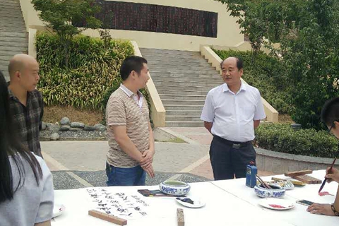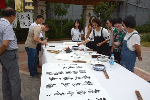 9月14日下午,藝術(shù)學(xué)院舉辦了以“迎國(guó)慶 慶中秋”為主題的書(shū)畫(huà)筆會(huì)。師生們?cè)谳疯髟蜂侀_(kāi)畫(huà)布,飽蘸濃墨,現(xiàn)場(chǎng)揮毫,共慶中秋佳節(jié)和祖國(guó)華誕的到來(lái)。黨委書(shū)記、校長(zhǎng)劉建林現(xiàn)場(chǎng)觀看了師生創(chuàng)作的書(shū)畫(huà)作品。