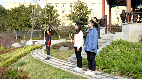 7:10,參加升旗儀式的全體師生列隊整齊、精神飽滿,佇立在升旗臺前?;膶W(xué)院國旗護衛(wèi)隊邁著整齊的步伐走向升旗臺,將國旗護送到升旗臺前。在雄壯的國歌聲中,鮮艷的五星紅旗冉冉升起,迎風(fēng)飄揚?,F(xiàn)場氣氛莊嚴(yán)肅穆,在場的每個人都神情嚴(yán)肅,心潮澎湃。在運動景觀平臺晨讀和學(xué)苑路行走的同學(xué)聽到國歌聲,也立即面朝國旗方向肅立行注目禮,向國旗表達最崇高的敬意。
