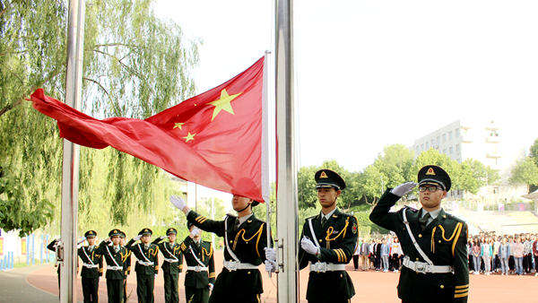迎著清晨的第一縷陽光,國(guó)旗護(hù)衛(wèi)隊(duì)邁著鏗鏘有力的步伐護(hù)送鮮艷的五星紅旗至升旗臺(tái)。伴隨著激昂雄壯的國(guó)歌聲,五星紅旗冉冉升起,迎風(fēng)飄揚(yáng),全體師生肅立行注目禮,表達(dá)對(duì)國(guó)旗的尊敬和對(duì)祖國(guó)的熱愛。