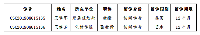 近日,國家留學(xué)基金委發(fā)布2019年西部地區(qū)人才培養(yǎng)特別項(xiàng)目(以下簡稱“西部項(xiàng)目”)錄取名單,我校發(fā)展規(guī)劃處王學(xué)軍教授,化材學(xué)院王建芳副教授獲得該項(xiàng)目的錄取資格,獲批公派出國留學(xué)一年。