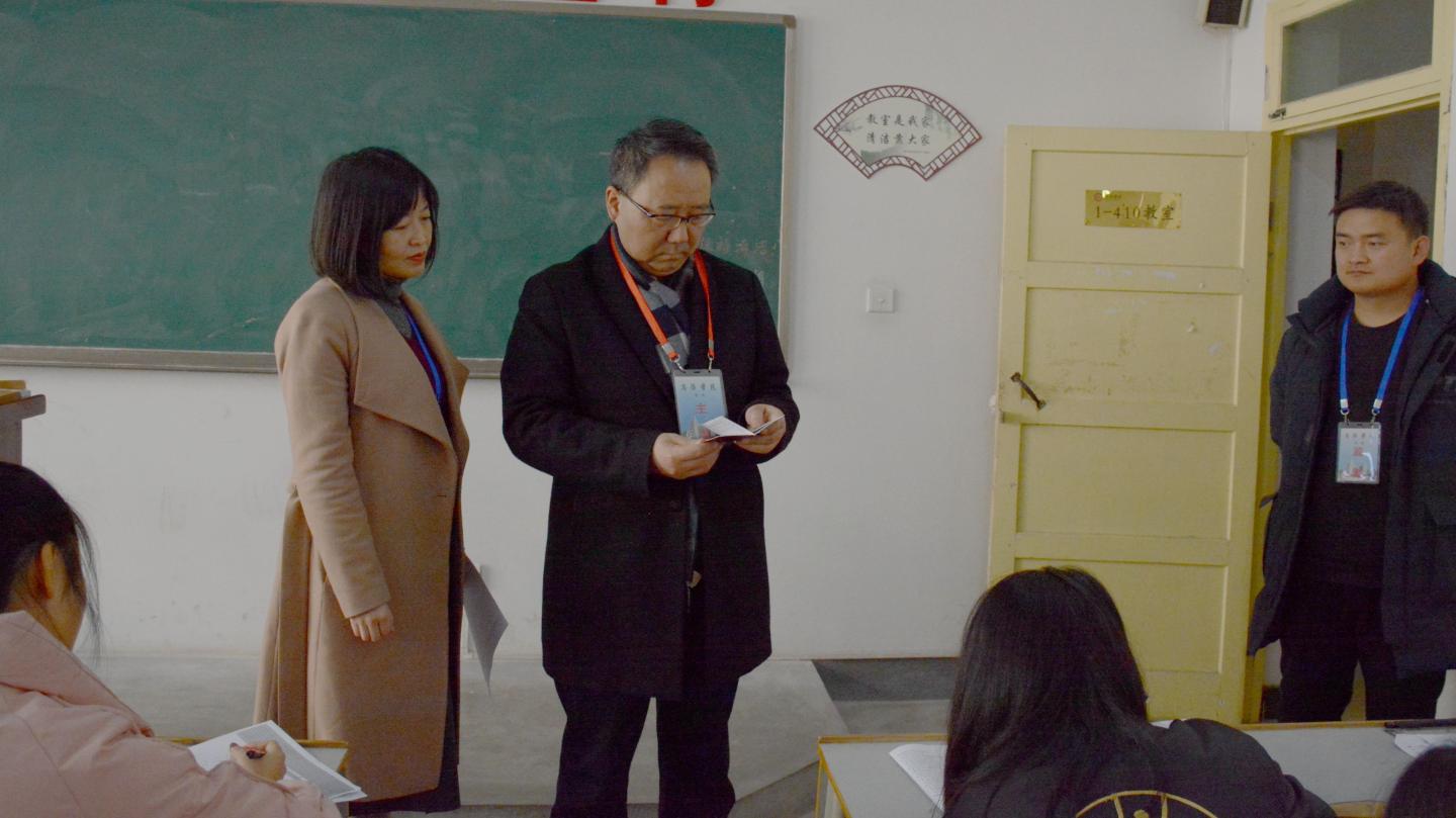 為進一步加強我??荚嚬芾?,嚴肅考風考紀,確保2020-2021學年第一學期期末考試工作順利進行,1月4日—5日,校黨委書記龍治剛、校長范新會、黨委副書記劉勇在教務處負責人的陪同下,分別深入北新街校區(qū)及丹江校區(qū)各考場檢查工作,實地了解考場環(huán)境秩序、疫情防控措施落實、學生考試狀態(tài)等情況,聽取相關工作匯報。