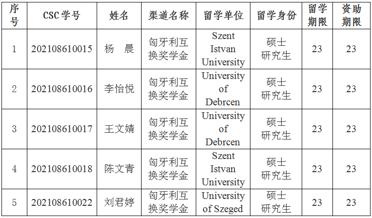 2021年度匈牙利互換獎學(xué)金項目錄取名單