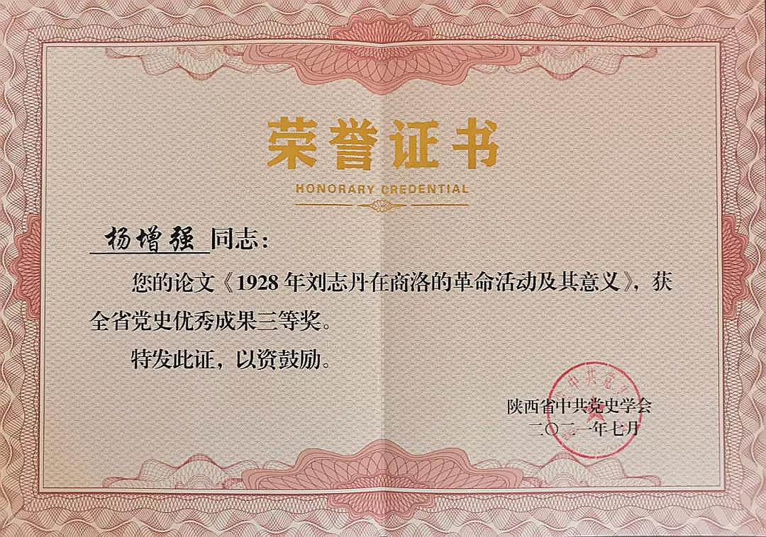 黨史學(xué)習(xí)教育開展以來,陜西省中共黨史學(xué)會(huì)在全省范圍內(nèi)開展了研究成果評獎(jiǎng)活動(dòng)。我校楊增強(qiáng)教授的論文《1928年劉志丹在商洛的革命活動(dòng)及其意義》在評選活動(dòng)中獲得全省黨史優(yōu)秀成果三等獎(jiǎng)。