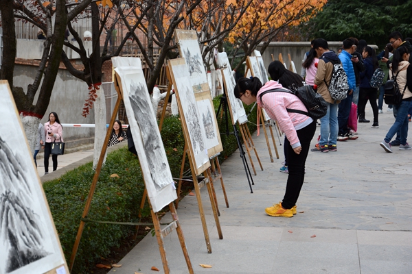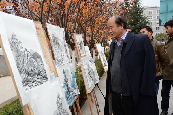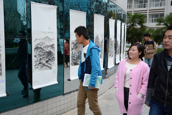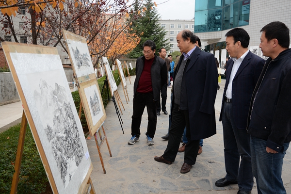 11月13日,我校1號教學(xué)樓前的通道兩側(cè)擺出了百余幅山水寫生國畫,引得過往師生紛紛駐足觀賞。這是由藝術(shù)學(xué)院舉辦的“秦嶺山水寫生掠影”作品展,匯集了美術(shù)學(xué)2013級105名學(xué)生的課程實踐作品。校黨委書記、校長劉建林,黨委副書記彭虎軍參觀了畫展并對我校學(xué)生的作品給予了高度評價。